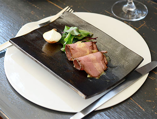 黒く光沢感ある器なので、赤身のお刺身や肉料理もよく映えます。