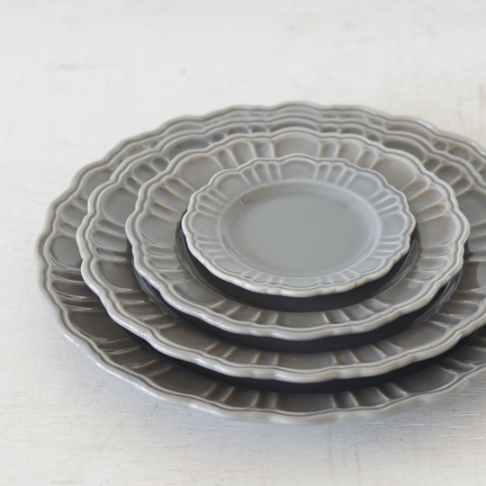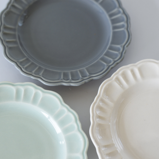 ペールブルーは少し可愛らしさがあり、グレーは凹凸の装飾が釉薬の濃淡で強調され、はっきりとした印象に仕上がっています。