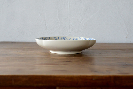 青を基調とした草花や動物などの図柄が全面に描かれている器を眺めるのが