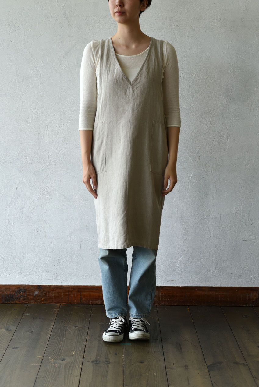 Vネックプルオーバーエプロンは台所仕事はもちろん、家事全般の仕事着としてもおすすめ。