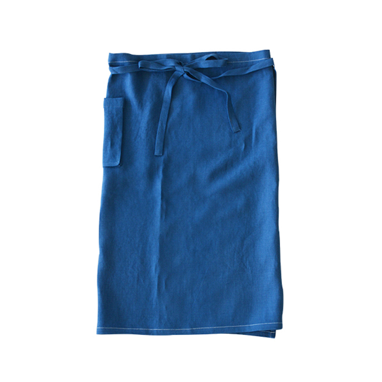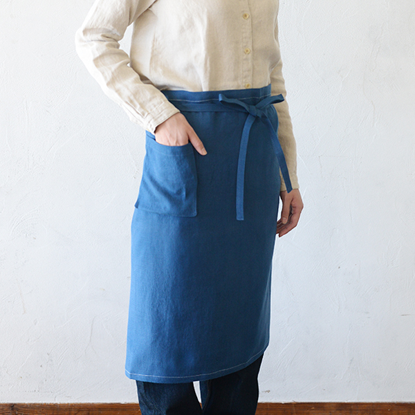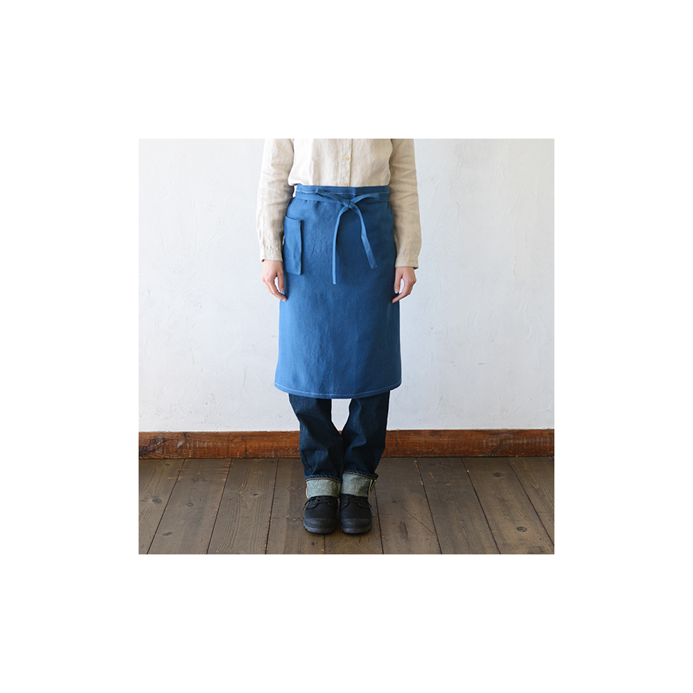 厚地でしっかりとした丈夫な生地ではあるが、くったりとした柔らかさがある。エプロンやギャルソンにしても付け心地がよく、無地のエプロンは洋服にも合わせやすい。---- スタジオエムのリネンは、主にフランス原産の長い繊維を使ったリネン糸を使用。選り分けた繊維を上質な糸にし、日本でなめらかで丈夫な生地に織り上げられます。オリジナルのチェックやストライプなど、デザインこだわって仕立てられた製品は毎日の暮らしの中で風合いや愛着が増し、ずっと心地よく使っていただけます。