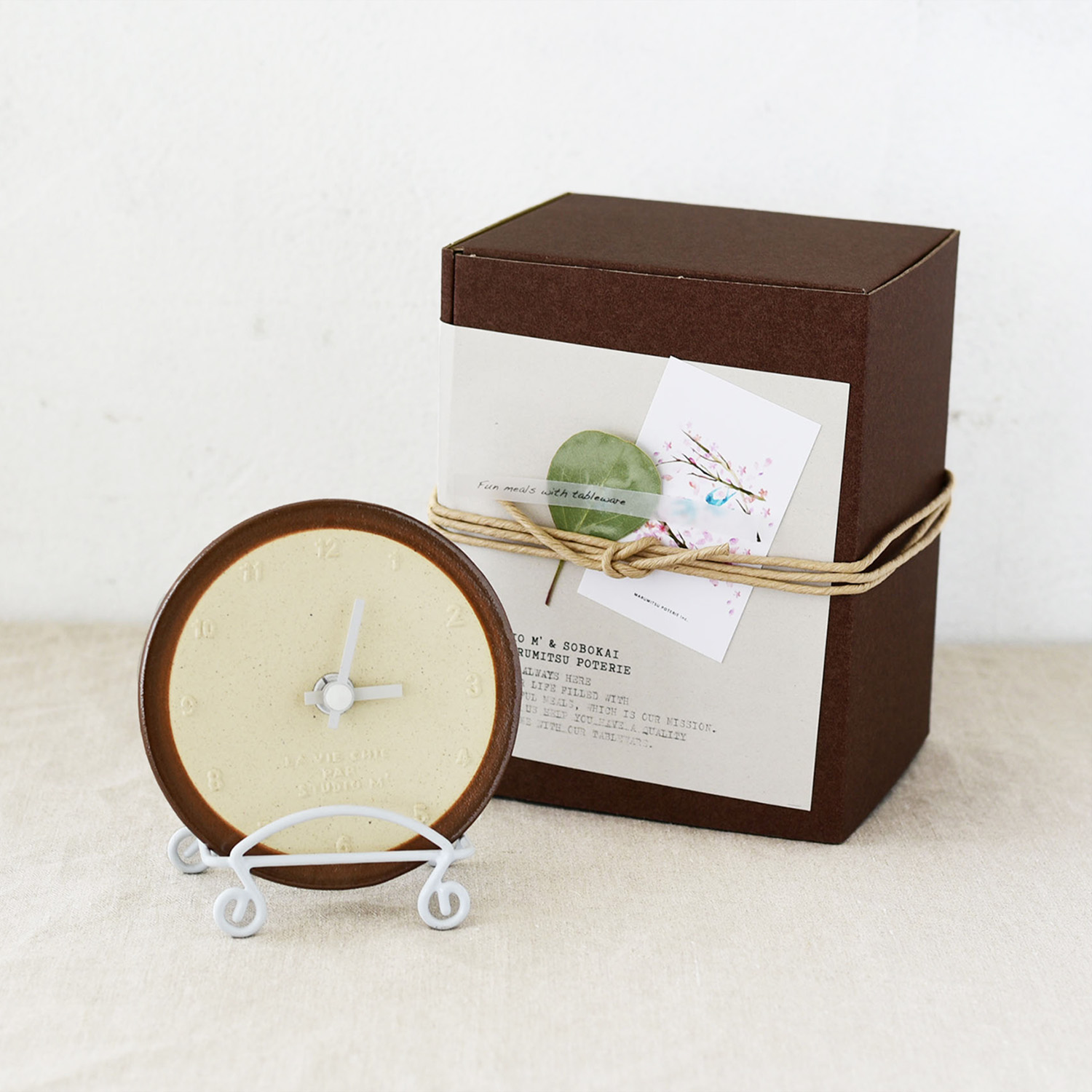 文字盤は陶器でできており、素朴で暖かみのあるデザイン。