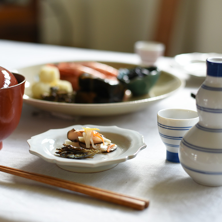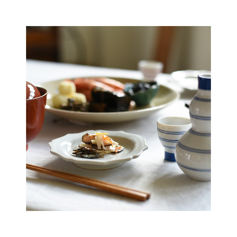 角のとれたフォルムで優しい雰囲気のお重「リセ」と、凛としていて上品な取皿「ジョリ」のセット。
