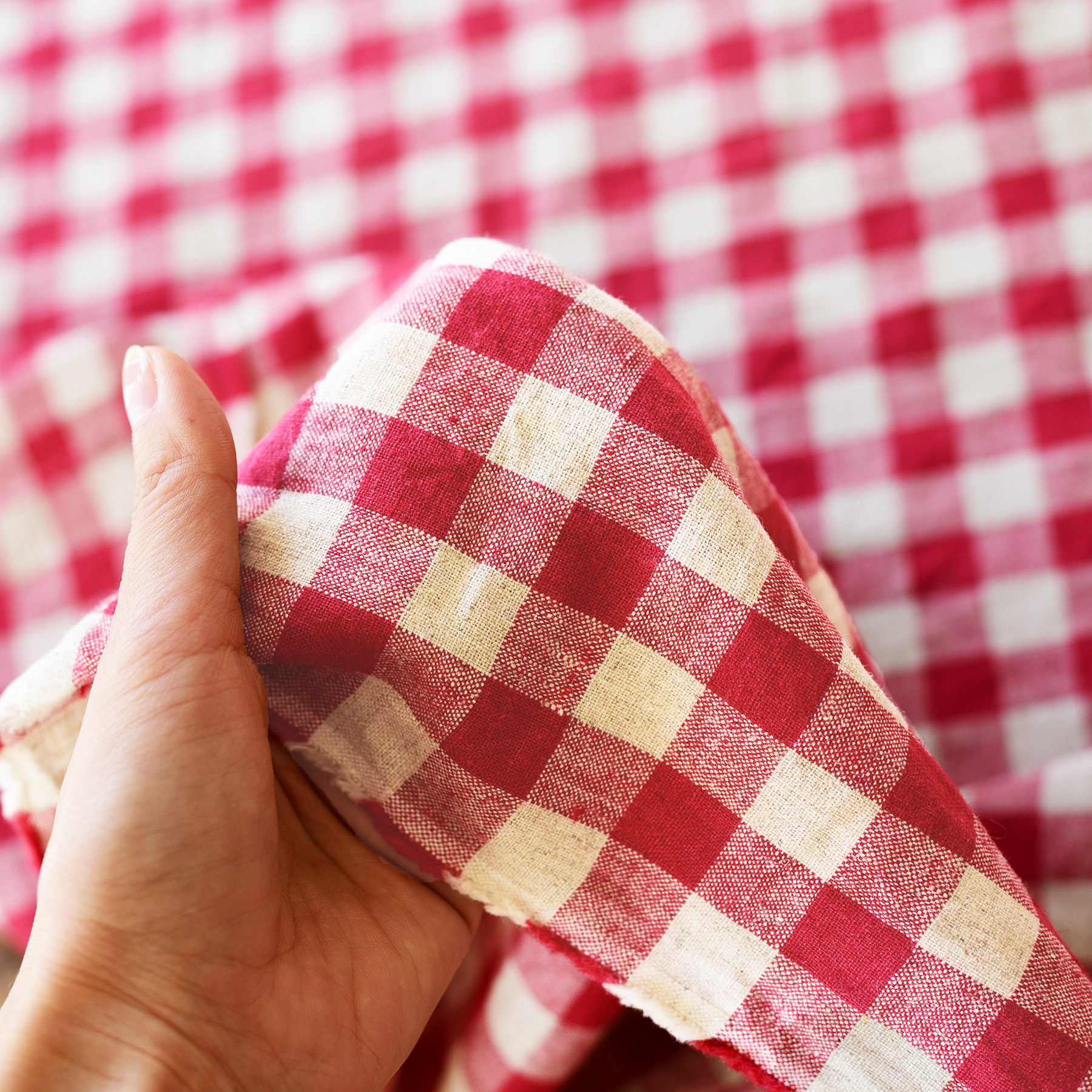 スタジオエムのファブリックの中で、昔から不動の人気を誇るクルート。シンプルな大きめのチェック柄でありながら、麻本来の素朴さが感じられる生成の糸を使用しているので、可愛いくなりすぎず使えるのが人気の理由です。クルートは30番手の糸を使用しているため、肌触りの良さに加え、少し生地厚で丈夫なのが特徴です。