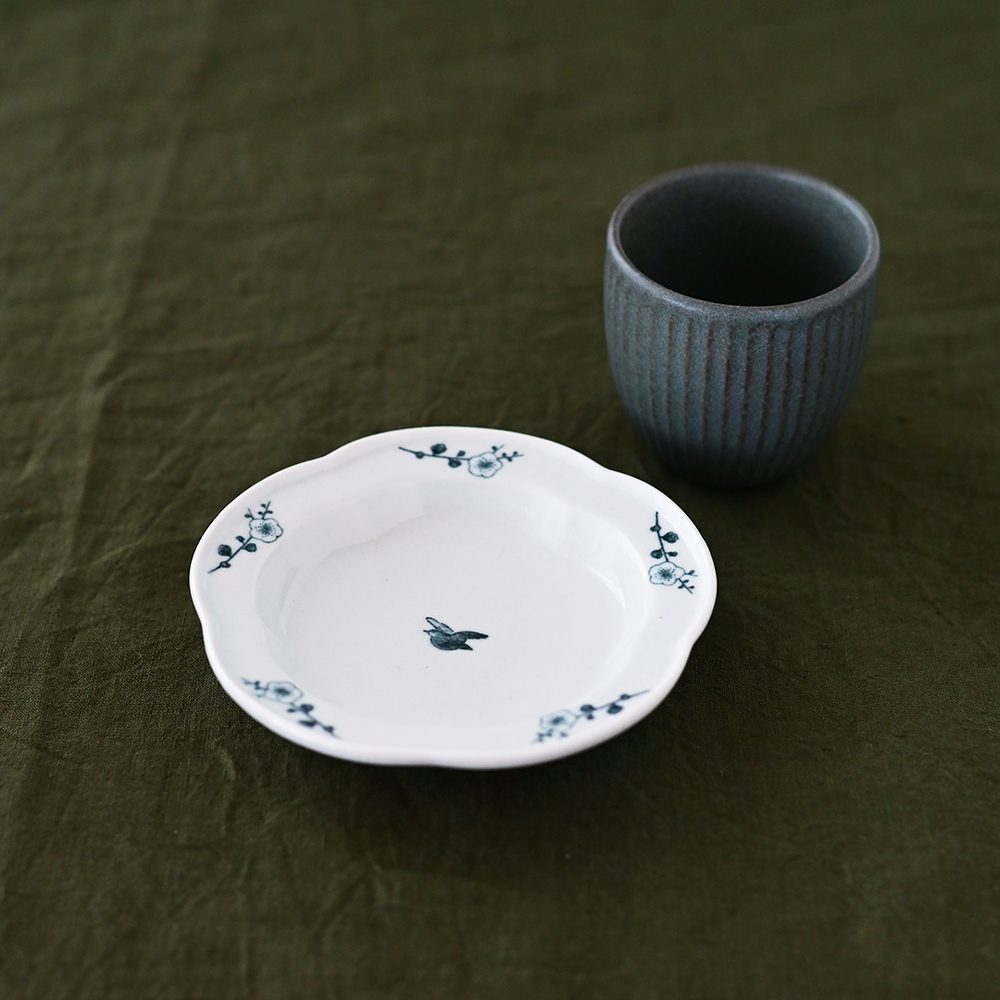 鎬文の湯呑みと梅花4寸皿のセット。和テイストがお好きな方におすすめのギフト。梅花の真ん中を飛んでいる鶯は3パターンあり、どんなデザインが届くかはお楽しみです。