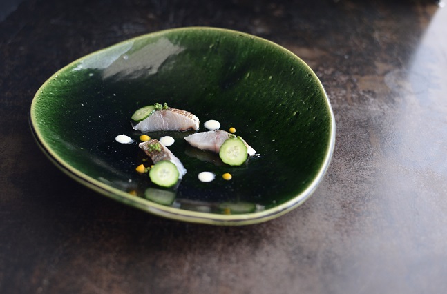 荒い土で作られた深い緑の織部は、お造りや炊合せ用で堂々とした印象になります。