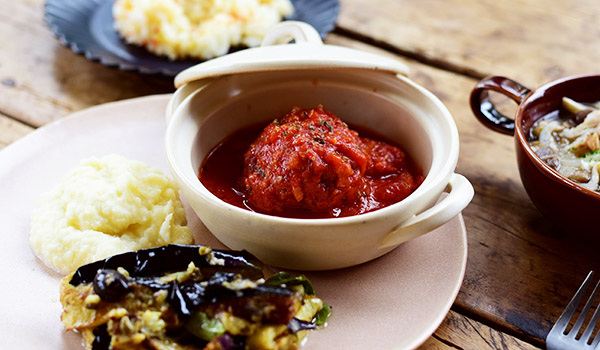 どの料理も耐熱陶器に盛り付けた後、オーブンで火を入れて仕上げます。