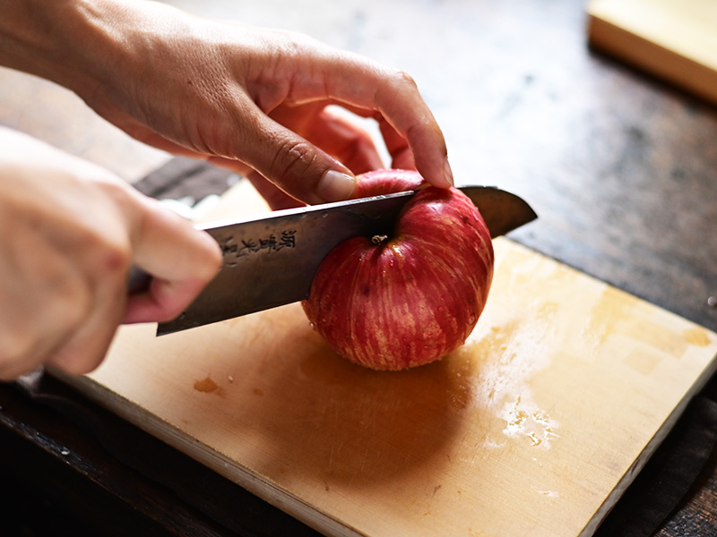 りんごは赤くきれいな色合いと食感を生かしてサラダに。