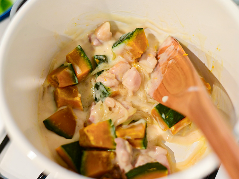 炒めた玉ねぎと鶏肉の鍋でホワイトソースを作り、かぼちゃを加える。