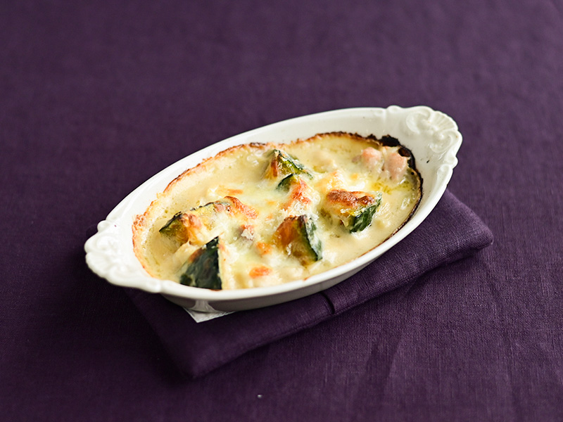 ほくほくと甘いかぼちゃが主役のグラタンにして味わう。
