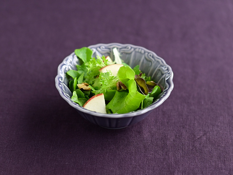 縁に華やかな装飾を施したボウルにりんごとくるみのサラダを入れて。