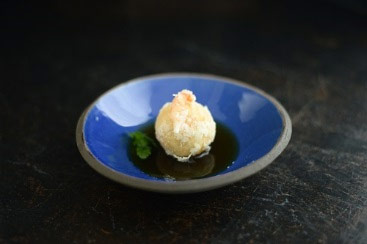 淡い黄色のえび団子と青のコントラストで料理が良く映える一品に。