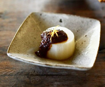 昆布だしでじっくり煮込んだ大根に、濃い味噌をあわせて頂く。