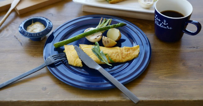 爽やかな海を連想させる濃紺プレートにオムレツ。紺と黄のコントラストがとても綺麗。