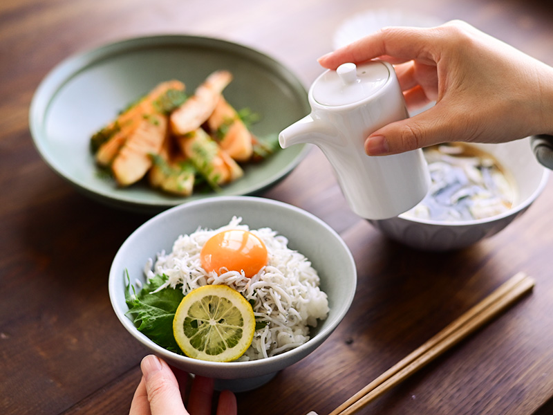 広がりのあるシルエットのお碗は高台があり、いつもの茶碗よりごちそう感がアップします。