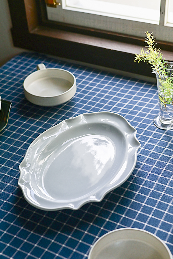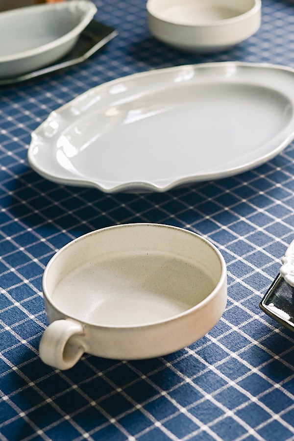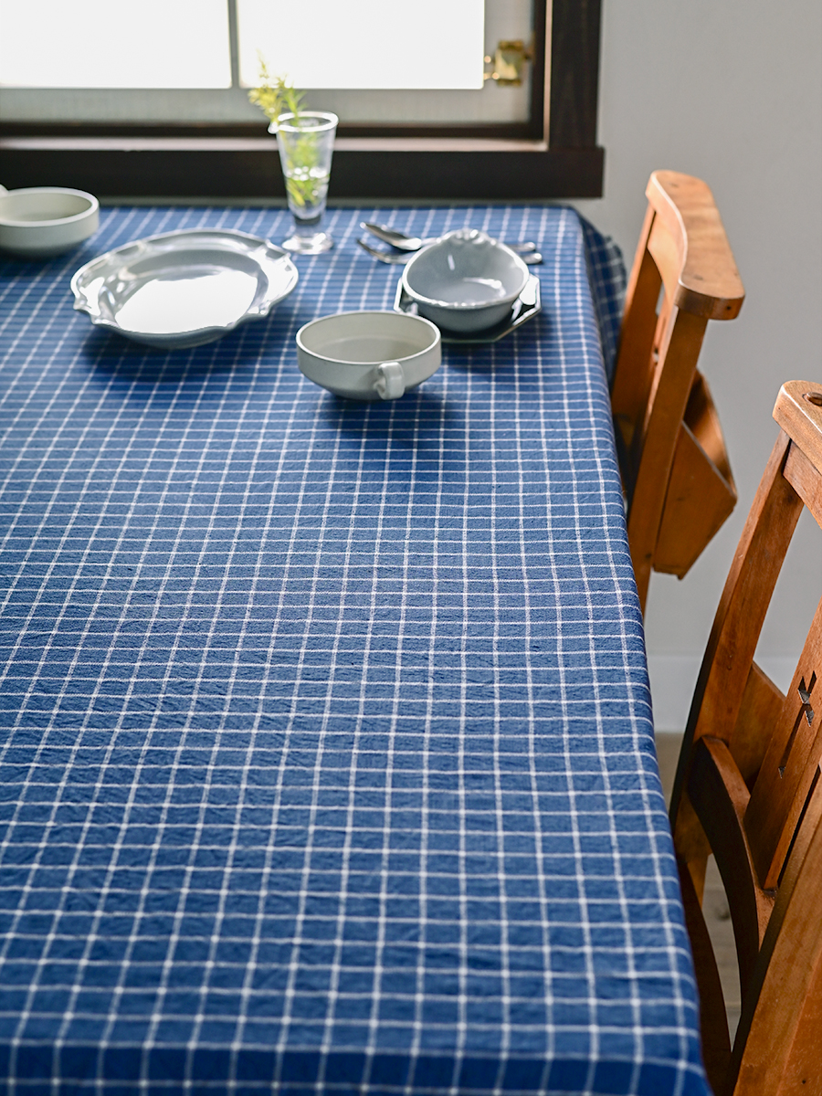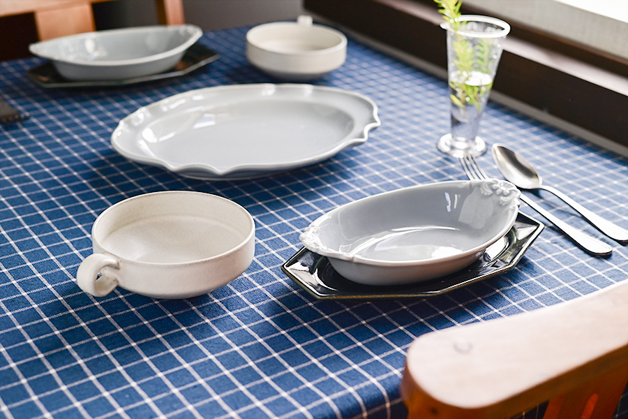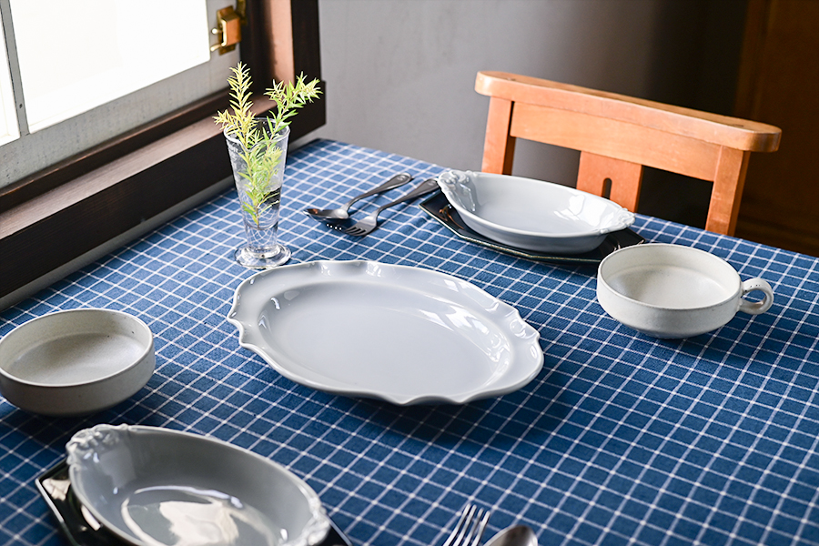 チェックのクロスに同系色の器を合わせた、穏やかな印象のコーディネート。さりげない装飾が施された器が、テーブルに上品な華やかさを添えます。器の数は多くなくても、重ね使いを取り入れることで、特別感のあるセッティングに仕上がります。