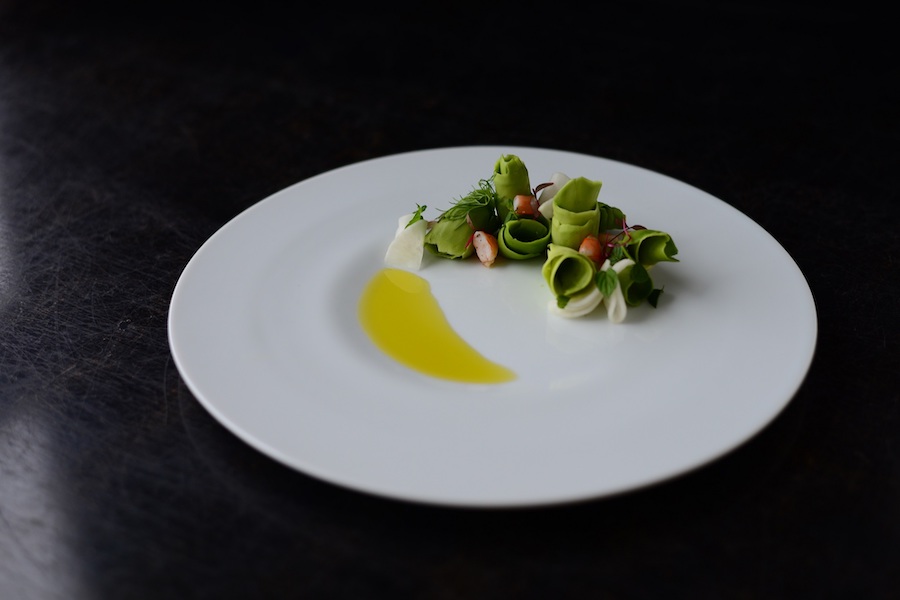 くぼみにソースを添わせたり、レリーフに沿って盛り付けたり、