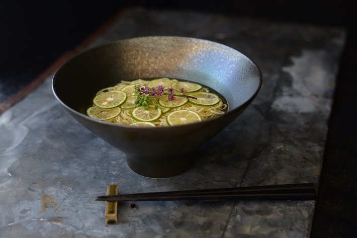 高さのある形に全面施釉された窯変黒は玉虫色の深みが増したように見え、高級感のあるチャイナレストランの麺料理に適しています。