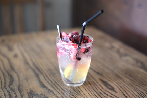 お店で手作りしたレモネードの原液を炭酸水で割り、ミックスベリーを贅沢に乗せたオリジナルレモンスカッシュ。