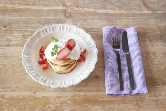 もちもちの食感のパンケーキの間にベリーソースをサンド。