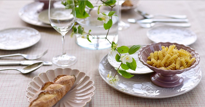 敷皿:フランボワーズ 280プレート/高台皿:/パン皿:ブロッサム 6.5寸楕円皿/カトラリー:シャルパンテ