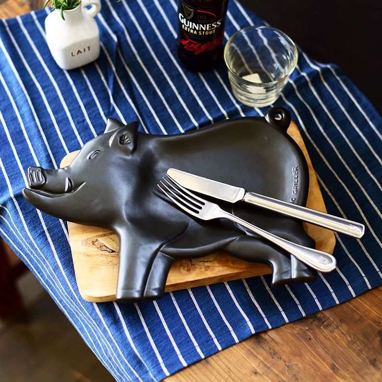リアルなブタの表情がたまらない、洒落た貯金箱。世界各地で縁起物のブタの貯金箱が幸運をもたらしてくれるかも。側面のロゴはフランス語でお金に関する言葉。