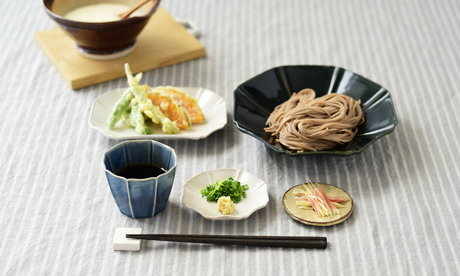 焼き立てパンと熱々スープで朝ご飯 ニュアンスカラーの器とストライプのクロスで 澄んだ空気に合う爽やかなコーディネートに
