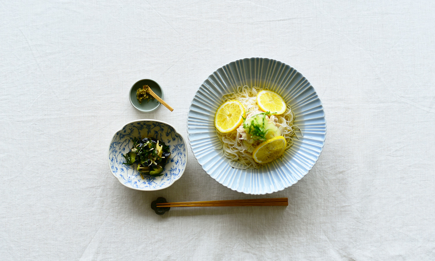 鮮やかな水色がきれいなメランジェのシエル。シエルはフランス語で空の意味です。今日は最近よく作っているラー油を加えて少し辛く味付けしたトマトそうめんを盛り付け...