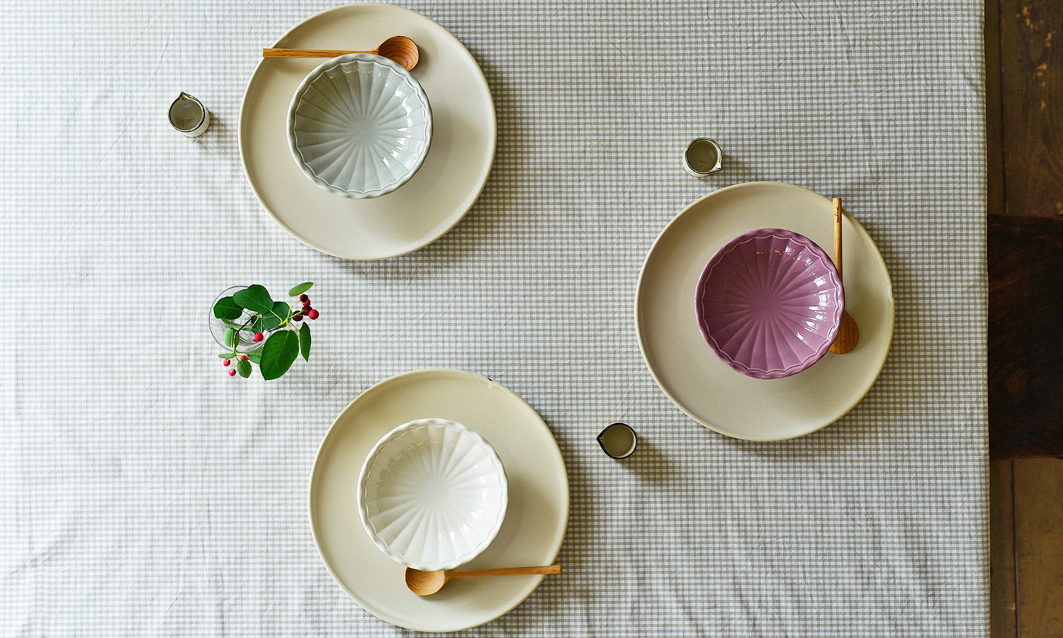 粉引や手描きのラインが印象的な茶碗に盛りつけると、いっそう味わい深く感じられます。 淡いピンクの茶碗は、薄手で軽やかな雰囲気が魅力。 透明感のある青磁の器は...