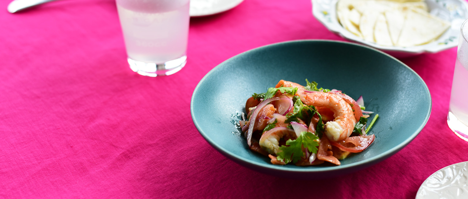 ペルーの民族衣装をイメージし、鮮やかな色をメインにコーディネートしました。衣装の花柄や細やかな装飾は、器の絵付や凹凸の花モチーフを組み合わせることで表現して...