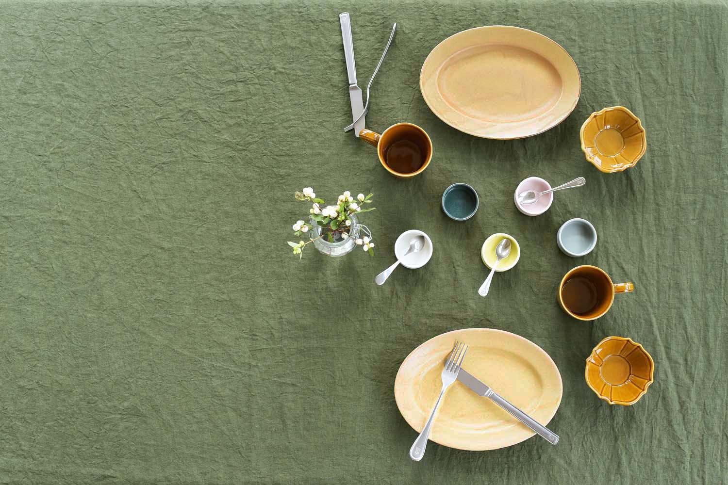 本日のディナーはお皿からはみ出すほどの大きな分厚いステーキ。カラフルな食器をカーキのテーブルクロスと合わせた大人の食卓で、豪快にかぶりつく幸せなひととき。