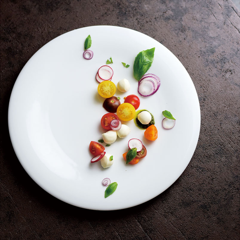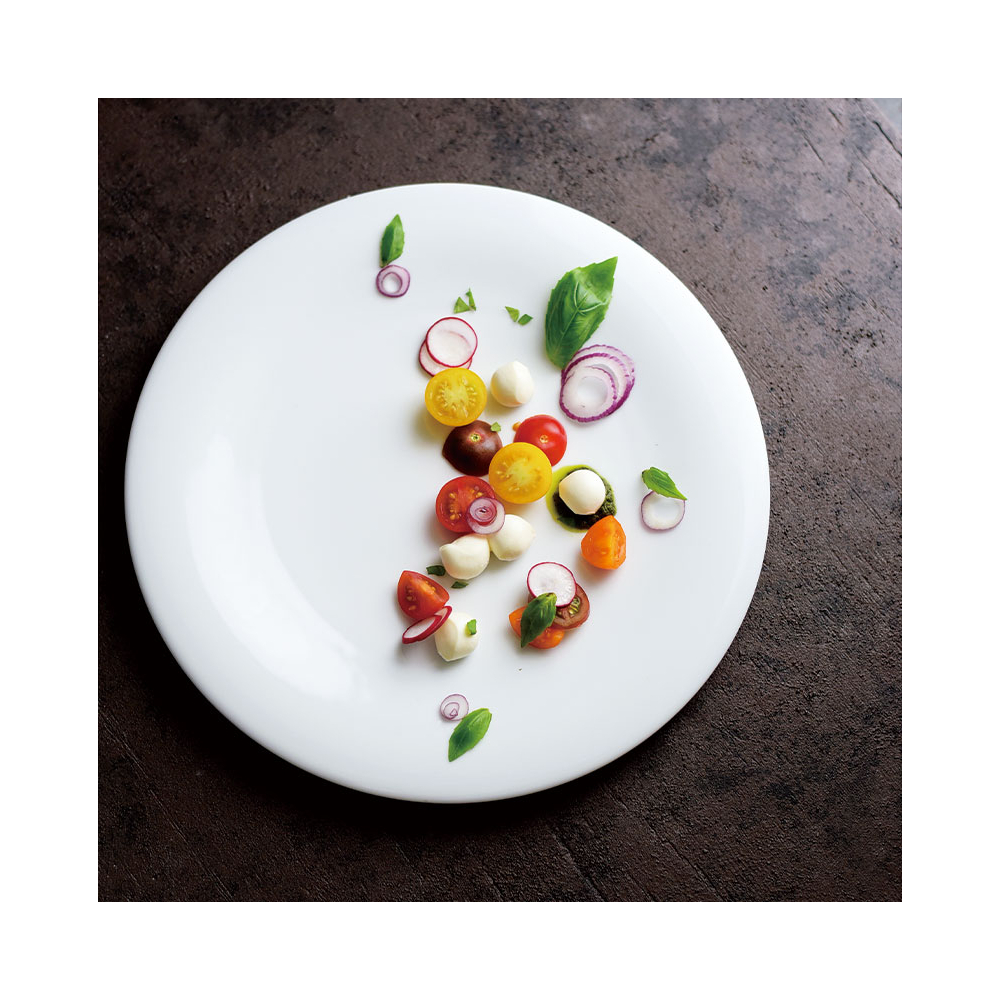 フェッタとはイタリア語で、「薄切りの」という意味です。極力フラットさを意識したシンプルなプレートで、滑らかなラインで仕上げたフォルムは料理を優しく受け止め、和洋問わず、また盛りつける物を選ばないプレートです。10"はメインのお料理や取り分け用に。