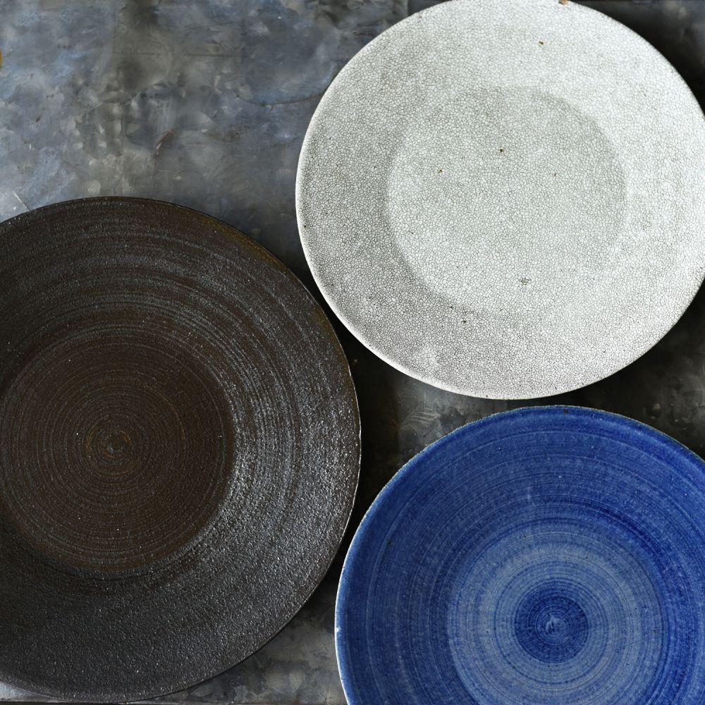 刷毛ムラによって生まれる濃淡が美しい藍染付と黒柿釉の3色展開。