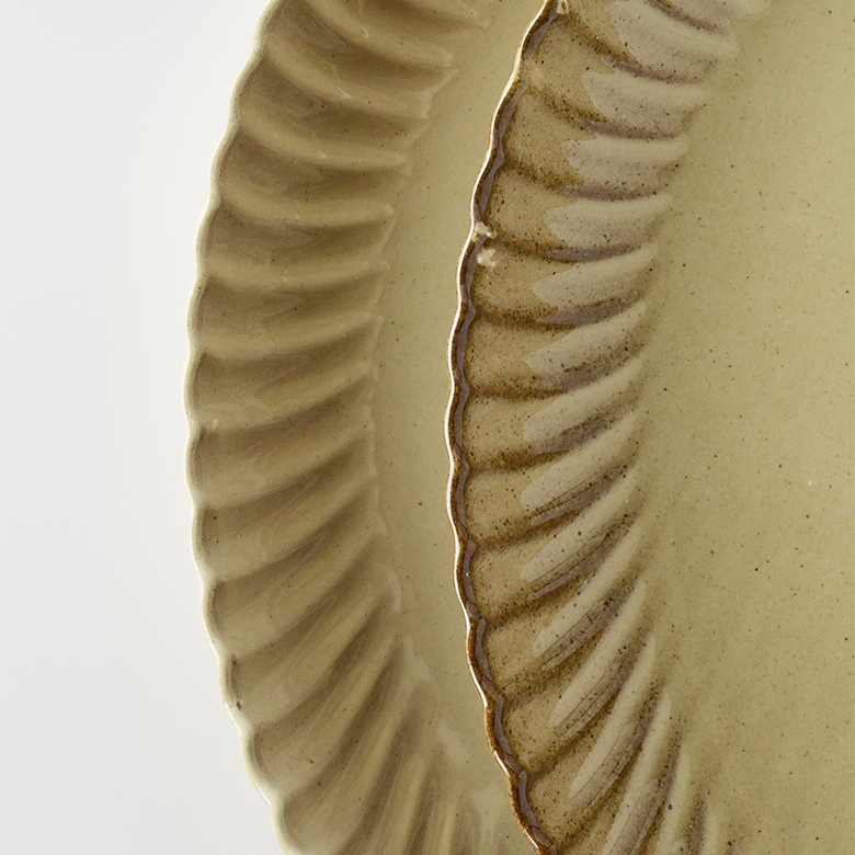 一個体の中で、釉薬や化粧土のムラがでます。1つの器の中において、色の表情が均一ではない箇所がある場合があります。器の形状などにより、釉薬の掛かり方が厚かったり、薄かったりする箇所があることが一つの要因です。それにより土の表情が一つの器のなかにおいても変化を見せます。
