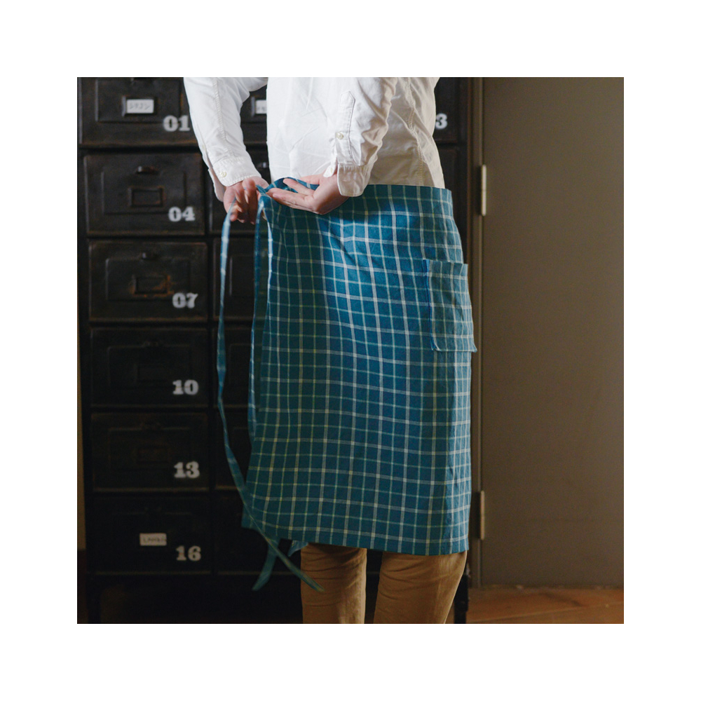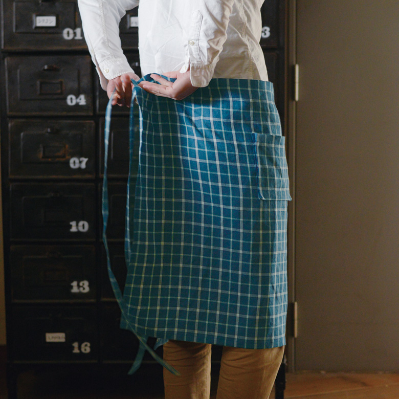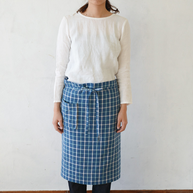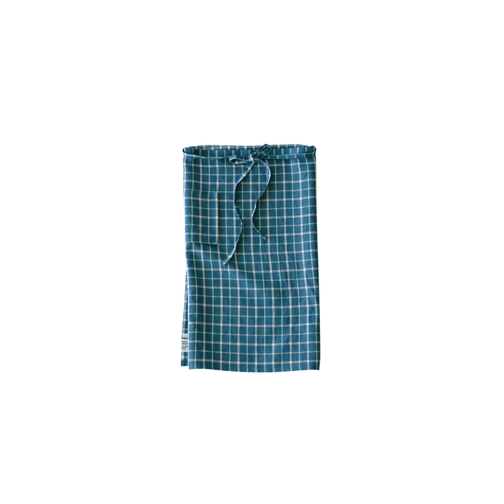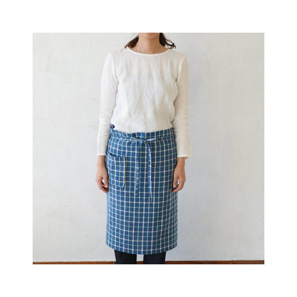 少しスモーキーなブルーベースのチェック生地は可愛らしくなりすぎない、落ち着いた雰囲気のチェック。生地のイメージは農家や田舎のキッチンで使い込まれたようなビンテージ感漂うチェック柄です。---- スタジオエムのリネンは、主にフランス原産の長い繊維を使ったリネン糸を使用。選り分けた繊維を上質な糸にし、日本でなめらかで丈夫な生地に織り上げられます。オリジナルのチェックやストライプなど、デザインこだわって仕立てられた製品は毎日の暮らしの中で風合いや愛着が増し、ずっと心地よく使っていただけます。
