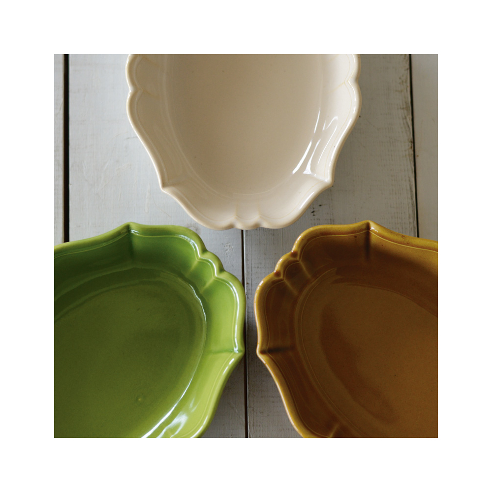 オーブンウェアでは珍しいグリーン色は爽やかで、料理やおおらかな装飾をより引き立ててくれます。
