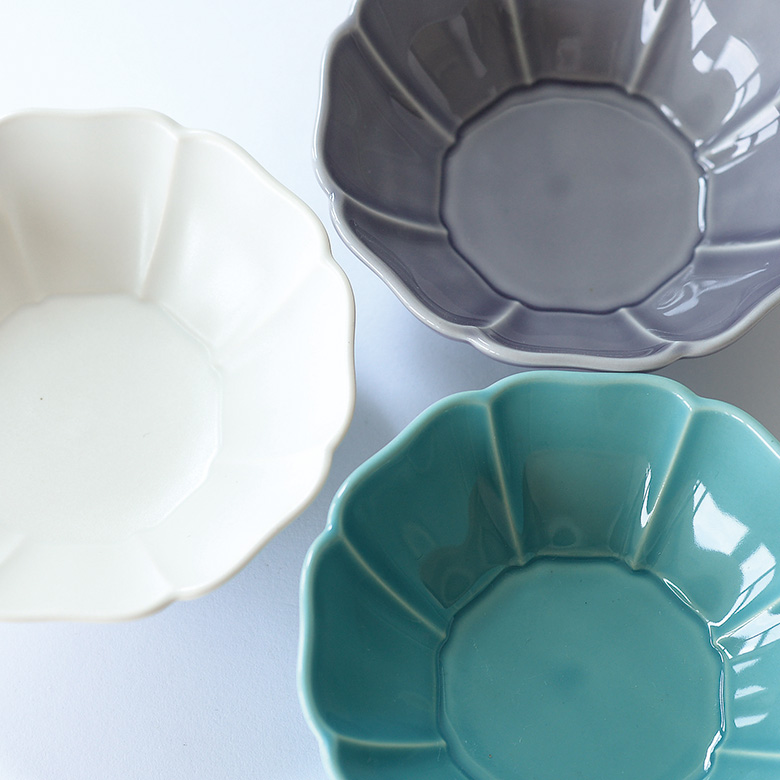 古典的な形をベースに細部の形状や色を工夫し、現代の食卓にマッチする花型の器。
