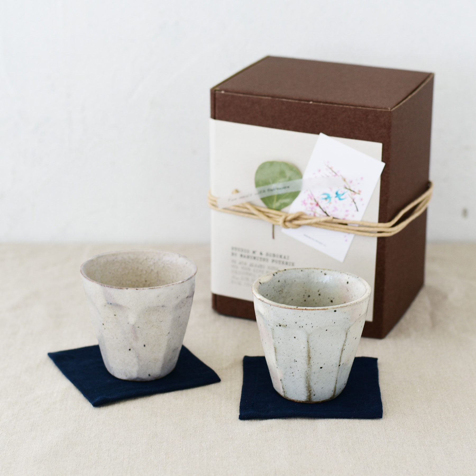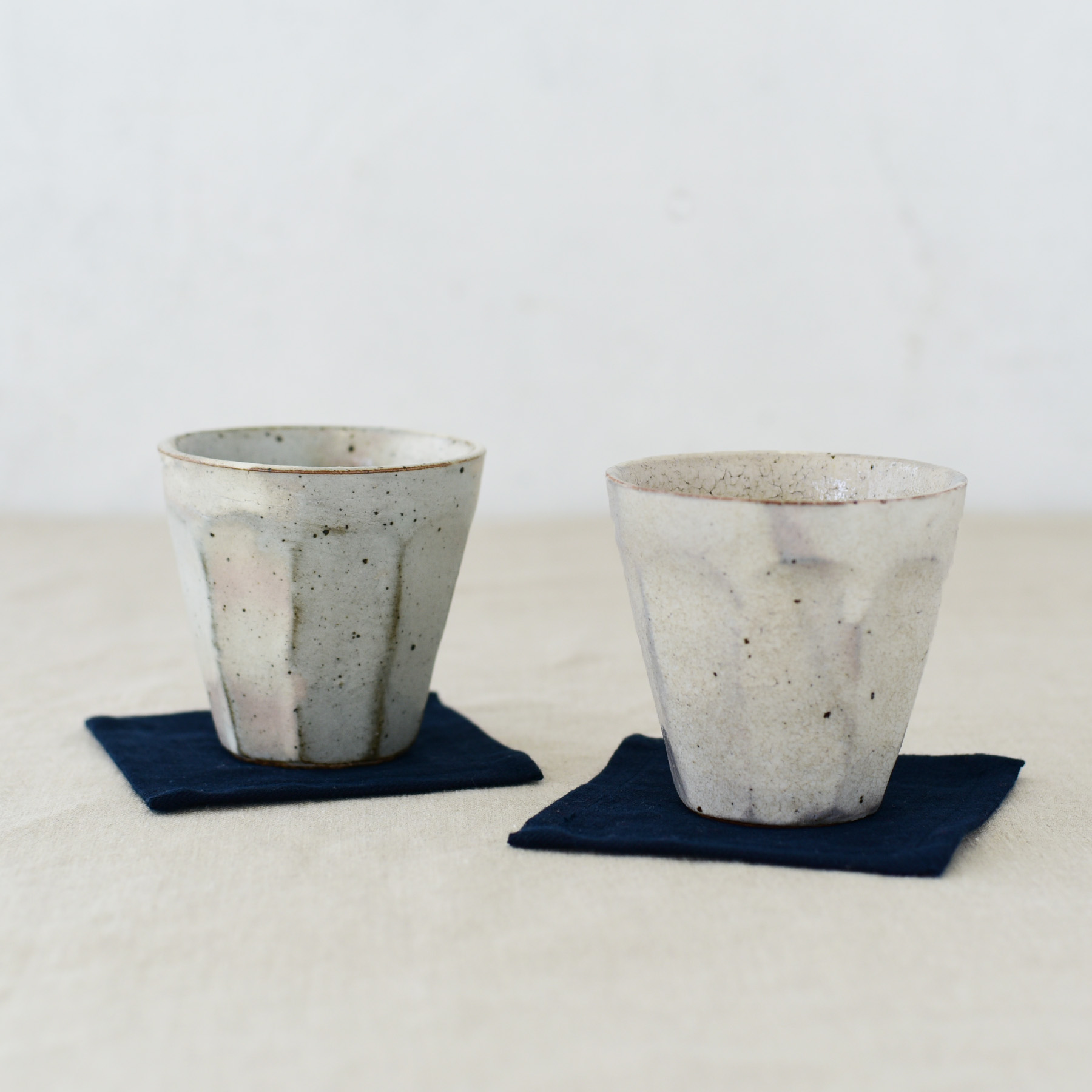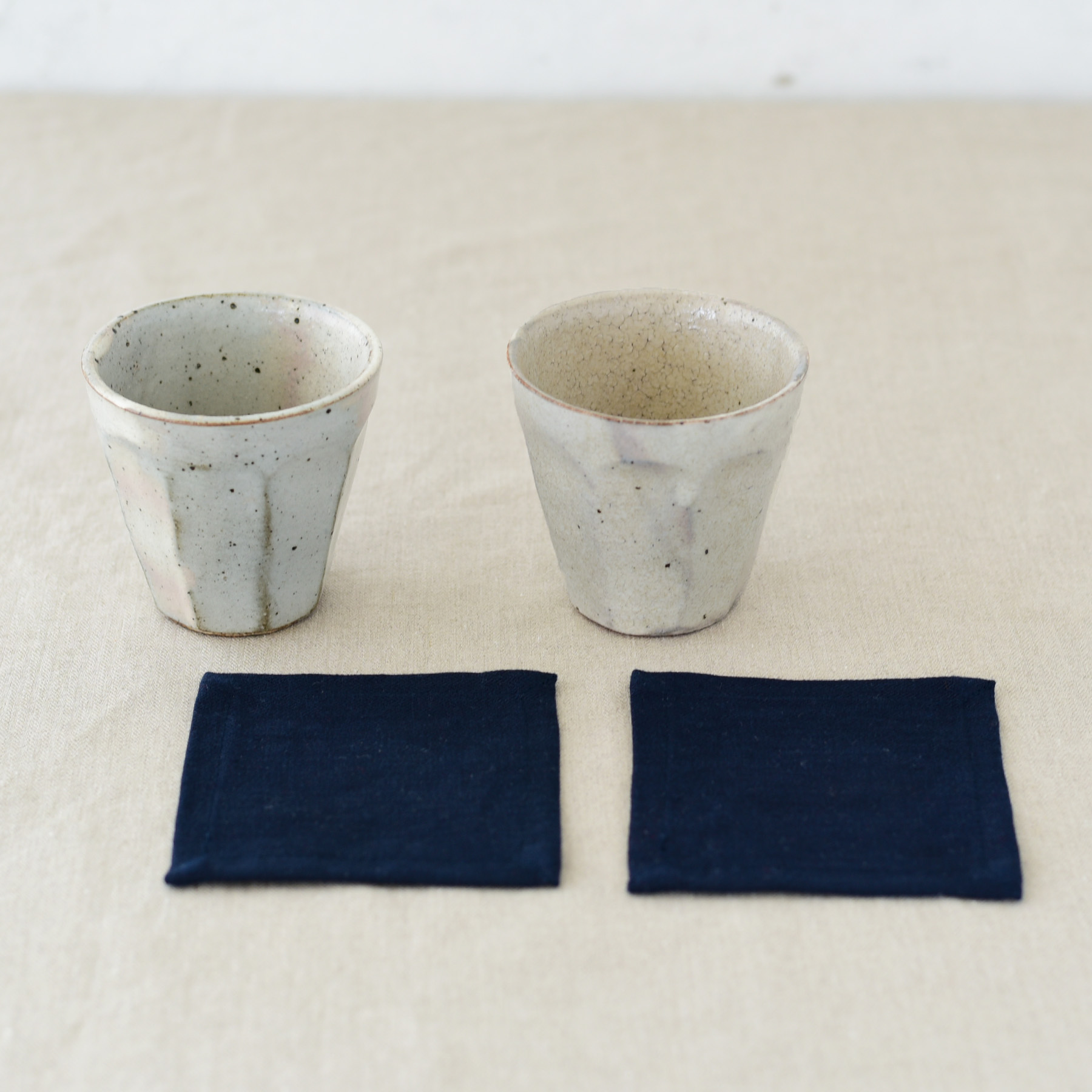 土の温かみを感じられ、味わいがあるカップと、国産リネンのコースターセット。