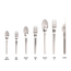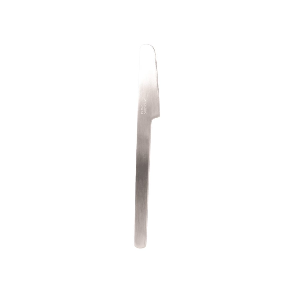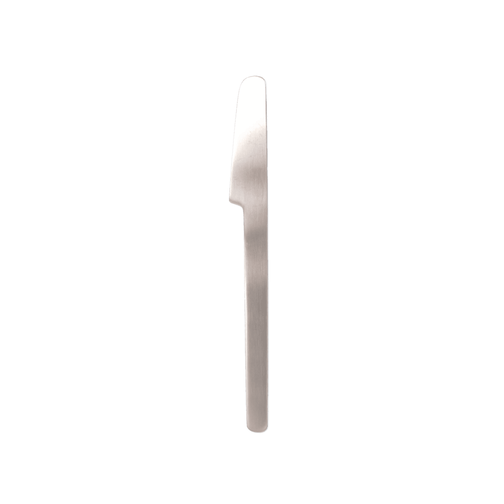 直線的でフラットなフォルムが特徴的なカトラリー。幅広の柄と連なった、刃の部分がコンパクトなデザイン。シンプルでありながら、どこかかっこよさやかわいらしさも感じられます。表面は、一方向に細い線状の傷を付ける表面加工によりツヤのないマットな仕上がりで、キズなども目立ちにくくなっています。洋食器だけでなく、和食器に合わせても馴染むデザインで、食事からおやつの時間まで、毎日使いたいカトラリーです。
