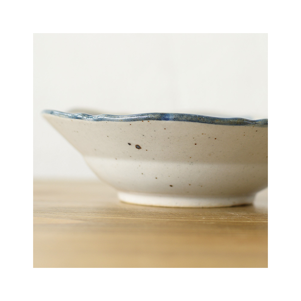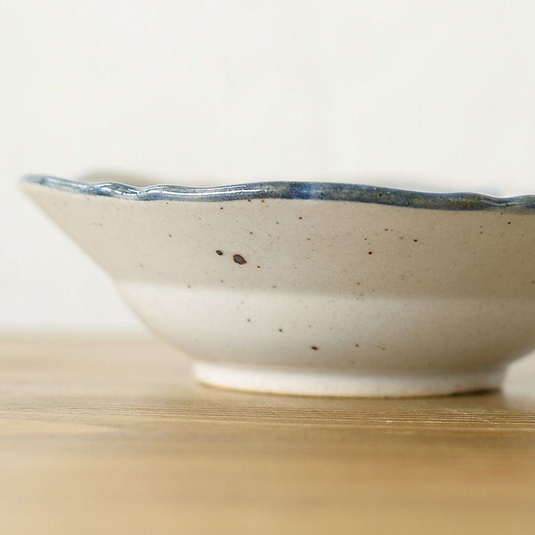一個体の中で、釉薬や化粧土のムラがでます。1つの器の中において、色の表情が均一ではない箇所がある場合があります。器の形状などにより、釉薬の掛かり方が厚かったり、薄かったりする箇所があることが一つの要因です。それにより土の表情が一つの器のなかにおいても変化を見せます。
