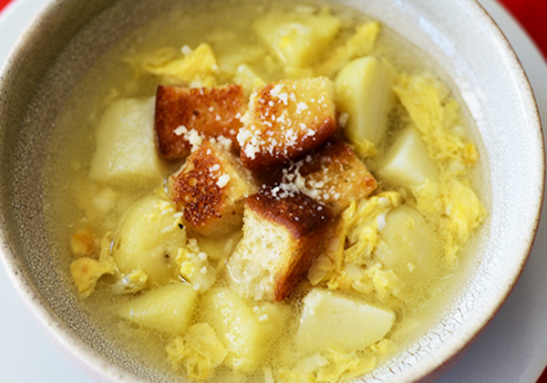 たっぷりのにんにくとじゃがいも、カリカリのクルトンが合わさって完成するチェコのスープ「チェスネチュカ」。風邪や二日酔いにも効くスープと言われているそうです。(過去に登場した世界のスープにも二日酔いに効くものがありましたね。)家庭にある基本的な材料でできますが、家だけでなくコース料理の1品としてレストランで提供されることもあります。チーズや鶏肉などのタンパク質を加えてアレンジを楽しんでみるのもおすすめです。