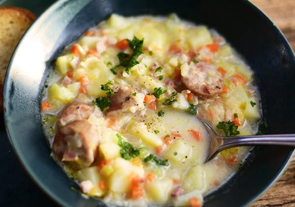 崩したじゃがいものとろみと生クリームでコクを感じるスープ