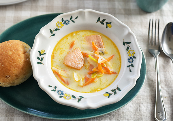 ノルウェーといえば、やっぱりサーモンや鱈などの魚を思い浮かべます。フィスクスパは、そんな漁業が盛んで海の幸に恵まれている国ならではの、家庭で定番のスープです。じゃがいも、にんじん、ネギなども入っていてボリューム満点。野菜類は細長く切るのがノルウェー流なんだとか。生クリームの他に、サワークリームを加えて酸味を出すのもフィスクスパのポイントです。
