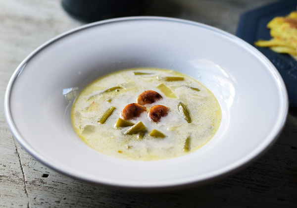 ボンヌシュルップはインゲンが主役のスープ。ルクセンブルクで昔から愛されている国民的な料理です。インゲンの他にはじゃがいもや玉ねぎ、地域によってはセロリやニンジンが入ります。最後にソーセージを添えるのは欠かせません。野菜だけで煮込むスープなのでさっぱりとしていますが、生クリームを加えることで深みのある味に仕上がります。今回はよく一緒に食べられる、じゃがいものパンケーキといただきます。