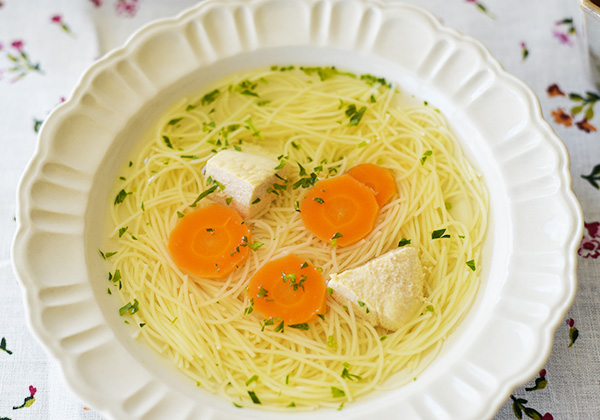 ロソルは鶏肉、野菜、ハーブをじっくり煮込んだ、ポーランドの伝統的なスープ。料理名はポーランド語で「rozsolić(塩を抜く」)という言葉に由来しています。昔は、保存用に塩漬けした肉を脱塩してから調理に使用していたためこの名がつきました。時間をかけて調理するので、現地ではお休みの日や特別な日に食べることが多いそうです。透明感のある美しいスープに仕上げるには、煮込む時にボコボコと沸騰させないことがポイント。