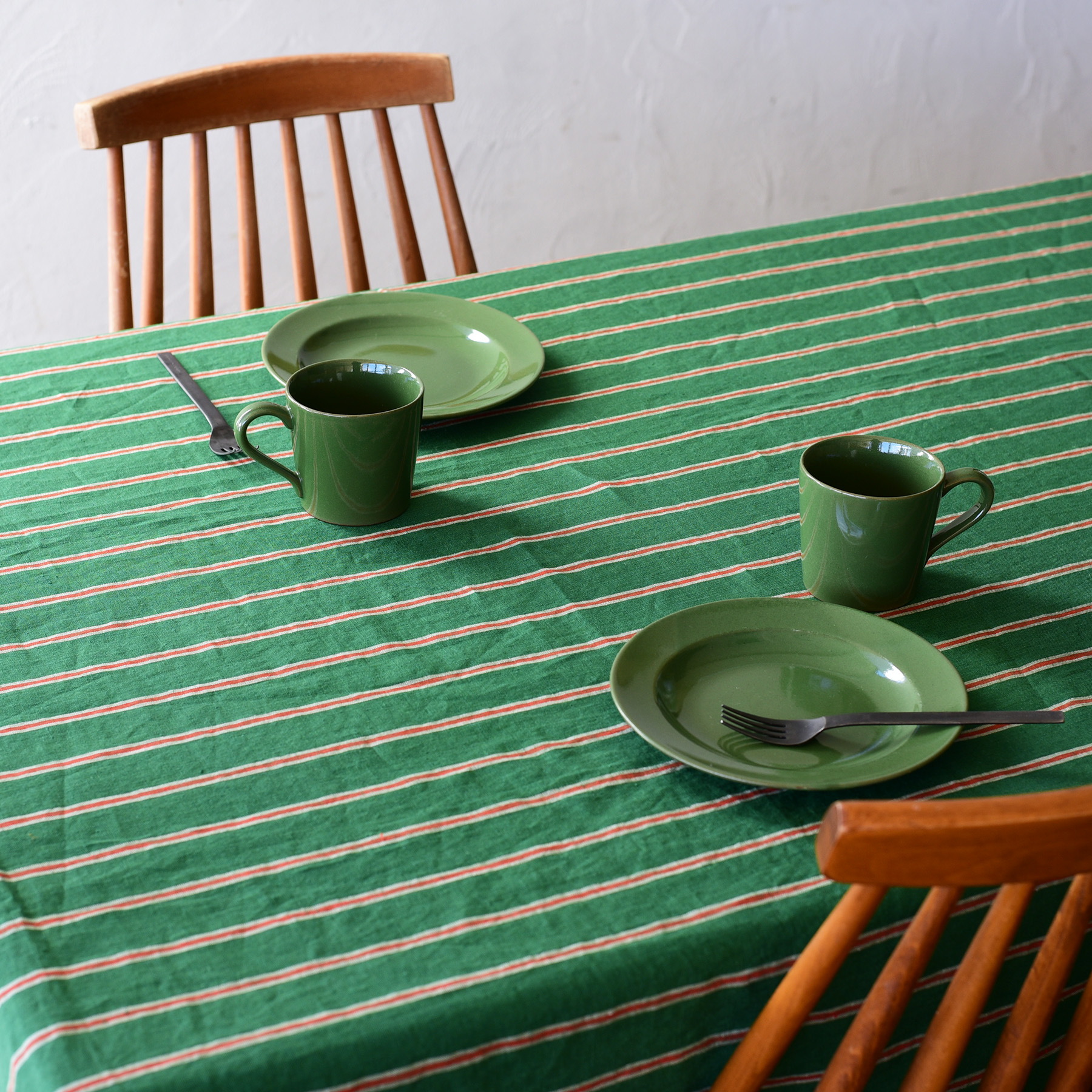 ブータン料理の味付けは塩、チーズ、バター、山椒が使われていますが、基本的には素材そのものの味を生かした料理がほとんどです。今回はその料理に見習って、素材の風合いを生かした器に盛り付けました。マットな質感というと均一な表情をイメージしますが、フントスは土の表情や釉薬の濃淡がよく現れています。クロスのノマドはグリーンをベースに朱色のストライプを配した、中東の異国情緒な雰囲気を感じさせる色合いがブータン料理にお似合いです。