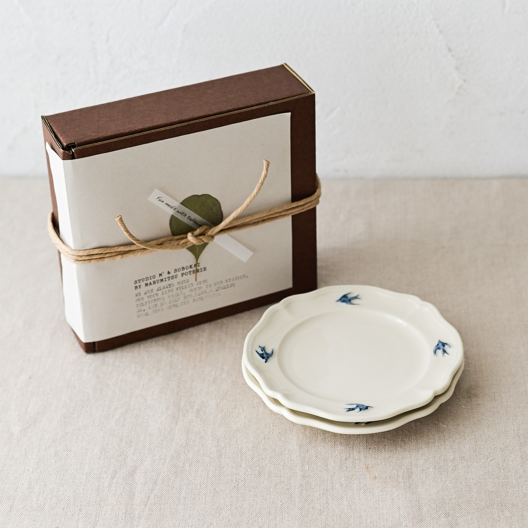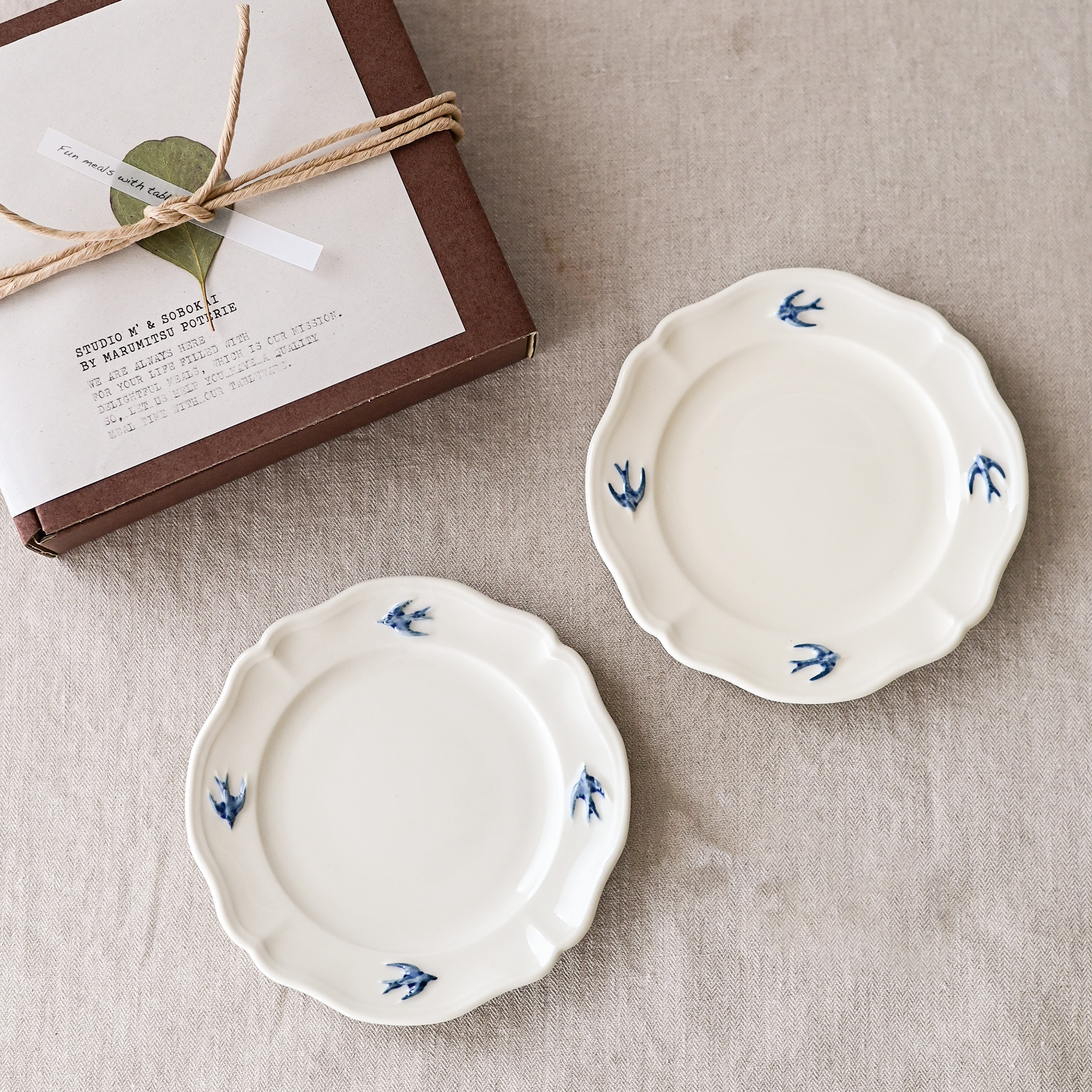 誕生日を迎える友人に贈るのは、青いツバメが印象的なアーリーバード。幸せの象徴とされる青い鳥は、お祝いの気持ちを伝えるのにぴったりです。 小ぶりなプレートは、おやつやフルーツにちょうどよいサイズ感。日々のひとときに、さりげなく寄り添ってくれる一枚になるよう願いを込めて。