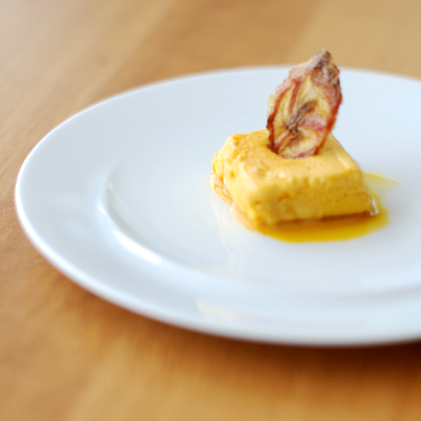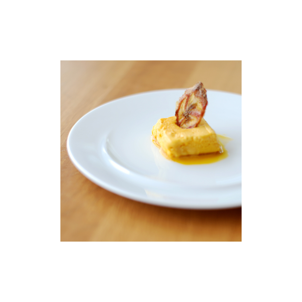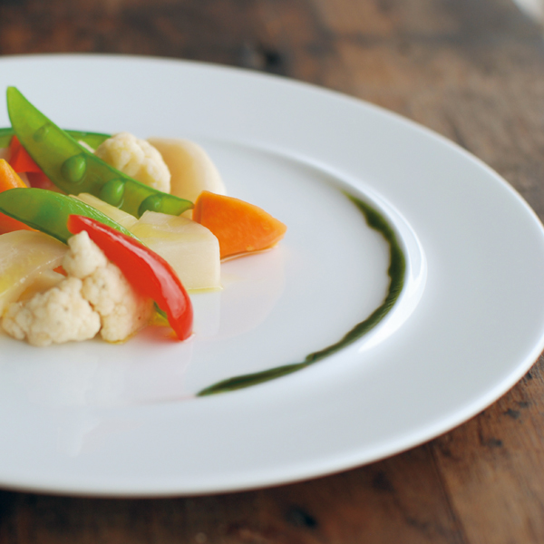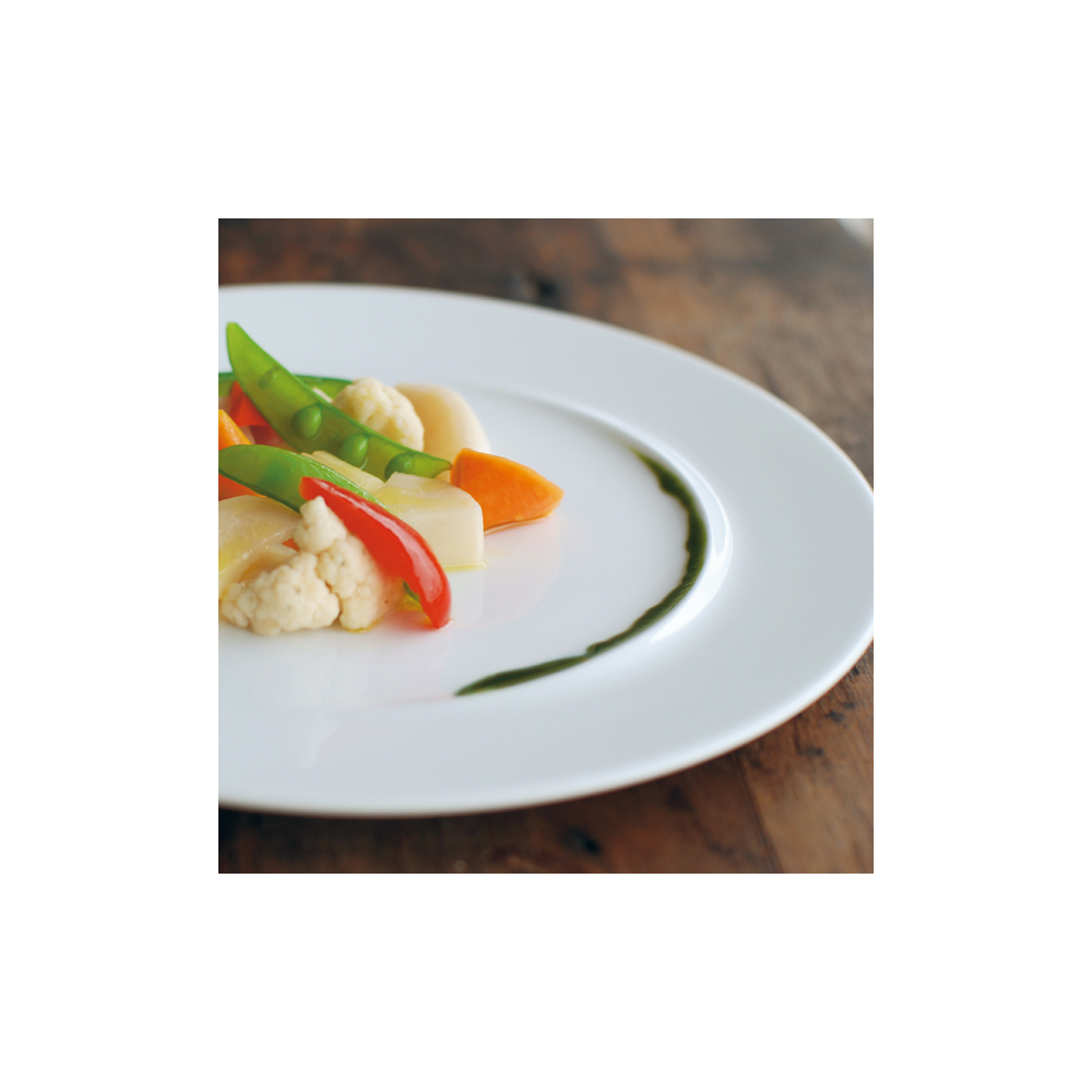 現代美術家のフォンタナからインスピレーションを受けて作られた、盛りつけ方を問いかけるプレート。使いやすい平らなプレートに一筋の立ち上がりがある。フラットなプレートとして使うのか、立ち上がりに沿わせて盛りつけるのか、何通りもの盛りつけ方を楽しめる器です。