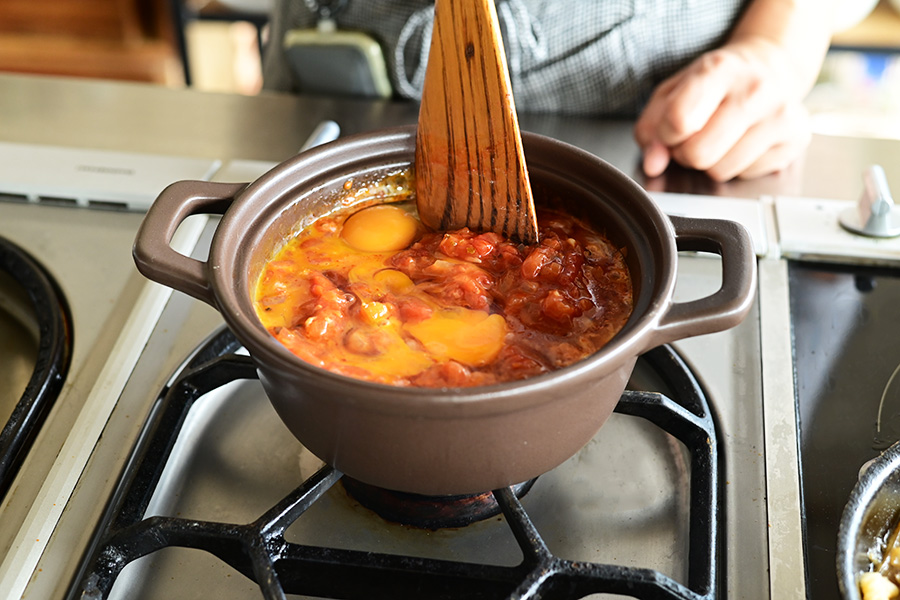 ガーナの家庭料理「エッグシチュー」に合わせて、大地の温もりを感じるコーディネートにしました。カーキ色のクロスが穏やかな背景となり、淡い色のナトゥラボウルが料理の鮮やかな色合いを引き立てます。広く平らな盛り面は、具材をたっぷりとのせても美しく見せてくれる器です。煮込み鍋には深みのある茶色のプチェロを使い、素朴で落ち着いた印象に。マグは生成り色を選び、全体にやわらかな統一感をもたせました。異国の香りを感じつつも、どこか懐かしい温もりが食卓に広がります。