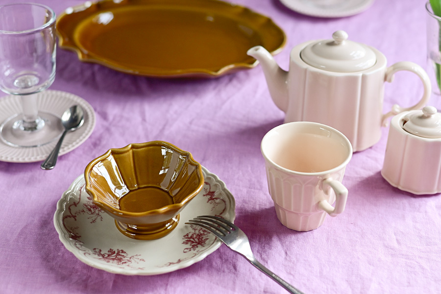 大きく緩やかな曲線の器は安定感や落ち着きを、細やかな装飾の器は華やかさや繊細さをテーブルに加えてくれます。 両方の器を組み合わせたことにより、全体のバランスが取れ、視覚的にも変化があり見応えのあるテーブルを作ることができます。
